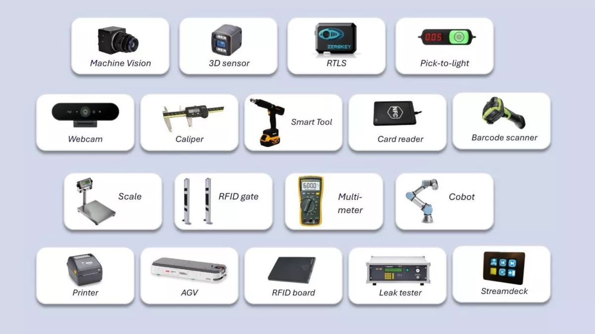 These include tools such as screwdrivers, torque wrenches, sensors, scales, barcode scanners, cameras, pick-to-light systems, and digital gauges, as well as PLC-controlled machines and test benches. Each connected device becomes a building block in a larger, coordinated network that ensures every action on the shop floor is validated, traceable, and repeatable.