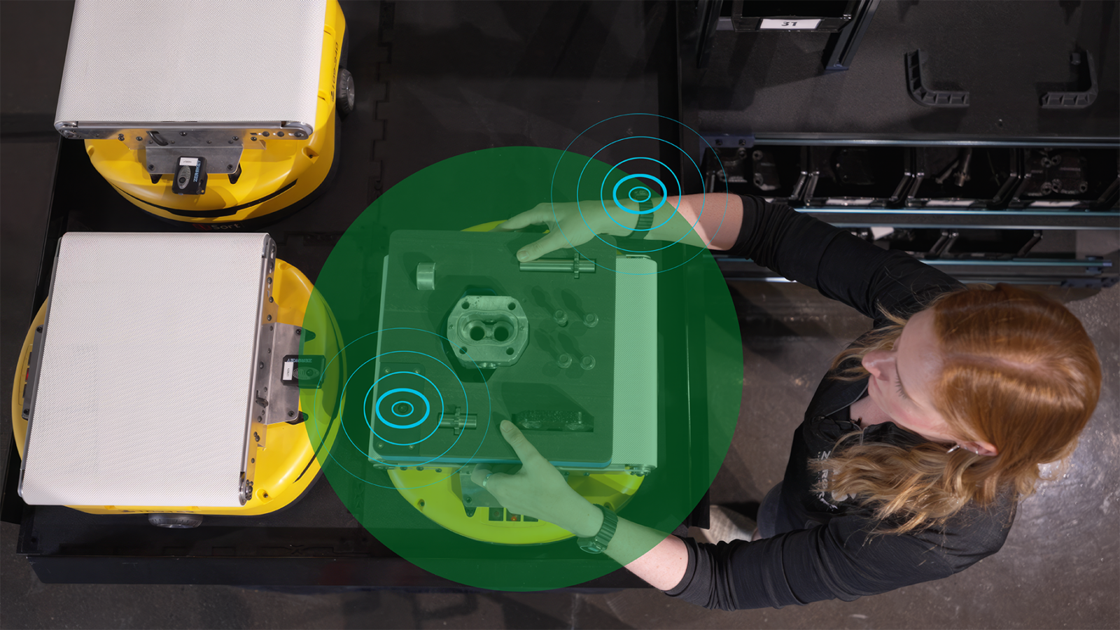 This interaction is made possible by the operator wearing a lightweight bracelet equipped with an RTLS tag, which precisely tracks hand movement in 3D space. As a result, manufacturers can replace physical buttons or scanners with a hands-free, intuitive, and hygienic confirmation method, improving both workflow efficiency and operator ergonomics while maintaining full process traceability.
