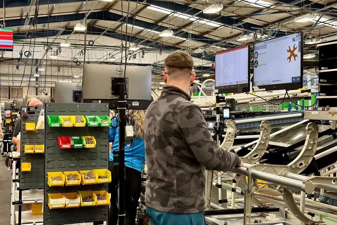 Parts availability is coordinated by the sourcing team, ensuring each workstation is always fully stocked. The first operator builds the seat base before passing it smoothly to the next station. Instead of lifting heavy components, seats travel along platforms mounted to a continuous track system, allowing operators to focus on precision, safety and quality.