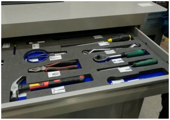 Tools are placed in a foam-cut board that travels with the operator, keeping visual control over every item.